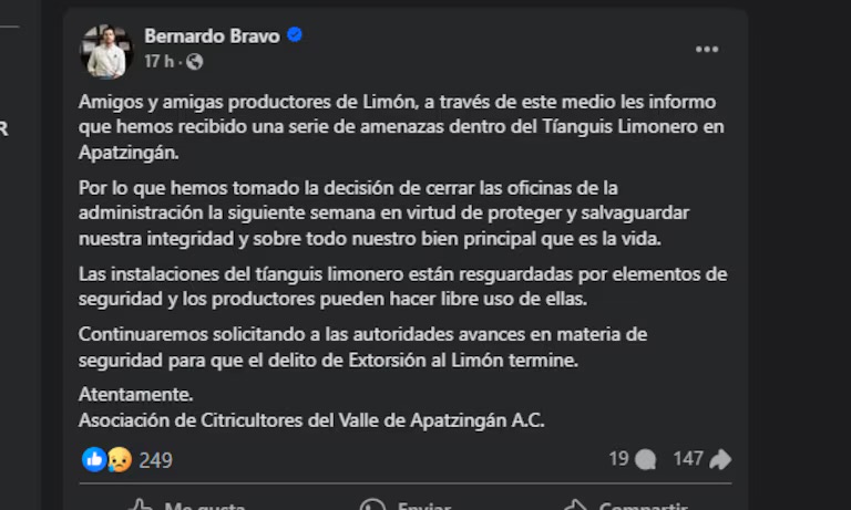 El líder citrícola había denunciado públicamente las extorsiones a productores de limón y participó activamente en paros y movilizaciones para exigir mejores precios y condiciones para el sector. En su última publicación en redes sociales, el sábado 18 de octubre, pidió sensibilidad ante la situación que enfrentaban los agricultores del Valle de Apatzingán y convocó a los ejidatarios a unirse para proteger su gremio.