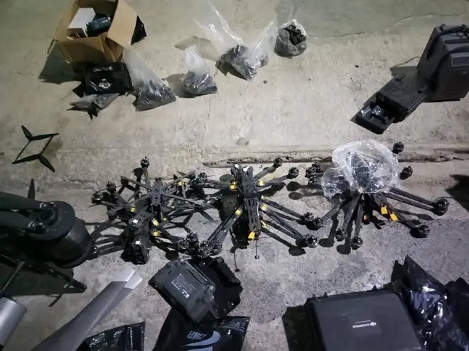 Durante la intervención, las autoridades aseguraron un arsenal que incluye 18 drones, 151 artefactos explosivos diseñados para acoplarse a los drones, dos dispositivos explosivos improvisados, 44 cartuchos, 26 cargadores, tres sistemas anti drones y dos armas de fuego. Además, se recuperó un vehículo con reporte de robo.