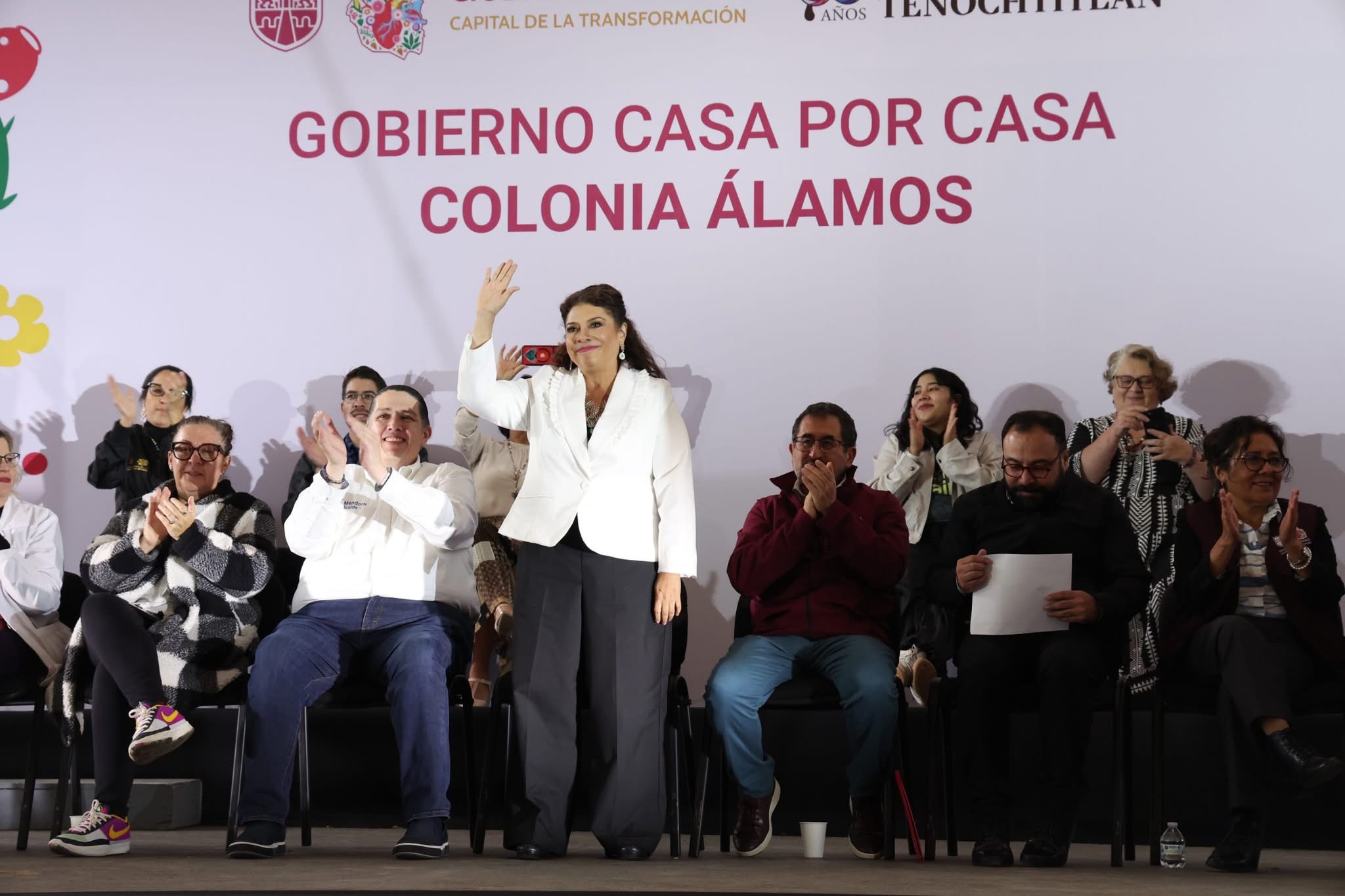 Durante la jornada del programa Casa por Casa en la colonia Álamos, alcaldía Benito Juárez, la Jefa de Gobierno, Clara Brugada Molina, adelantó las acciones de repavimentación y renovación del alumbrado público que beneficiarán a esta y otras comunidades de la capital.