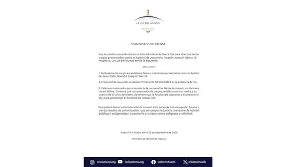 Este caso ocurre mientras el líder de La Luz del Mundo, Naasón Joaquín García, enfrenta acusaciones en Estados Unidos por crimen organizado, tráfico sexual y delitos financieros. La propia iglesia ha rechazado los señalamientos y denunció una supuesta persecución legal y mediática en contra de su organización y de sus dirigentes.