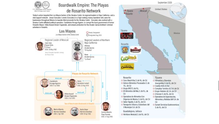 La medida se da en el marco de la política antidrogas y lucha contra el lavado de dinero, y busca desmantelar la red que mantiene a la facción de “La Mayiza” bajo el control de los hermanos Alfonso y René Arzate, conocidos como “El Aquiles” y “La Rana”. La OFAC detalla que durante la administración de Brown en Rosarito, operadores del cártel como Jesús González y Candelario Arcega fortalecieron su influencia en el gobierno municipal, asegurando protección para las actividades criminales y facilitando pagos de extorsión.