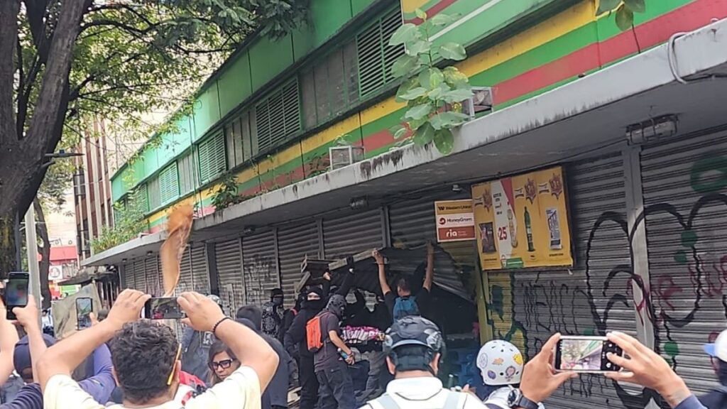 Los hechos ocurrieron alrededor de las 16:10 horas, cuando jóvenes vestidos de negro comenzaron a realizar pintas en la fachada del comercio. Minutos después, forzaron parcialmente la cortina de metal y lograron ingresar al establecimiento, extrayendo botellas de agua y rompiendo botellas de alcohol. No se reportó presencia inmediata de elementos de seguridad, lo que permitió que los responsables se retiraran rápidamente.
